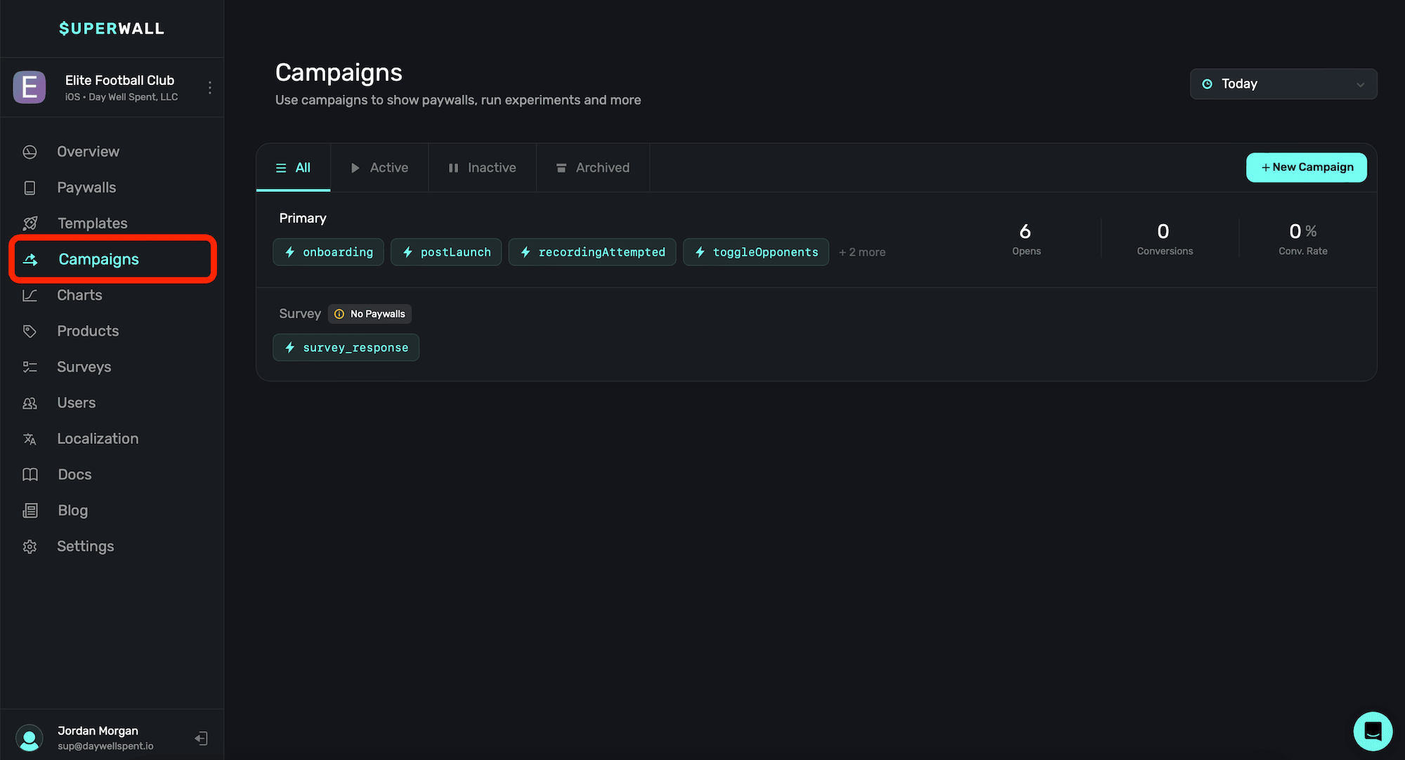 If the campaign isn't currently serving any paywalls because none have been attached to it, you'll see a wanting indicating that in this view. In the image above, that's the case for the campaign at the bottom, called "Survey".