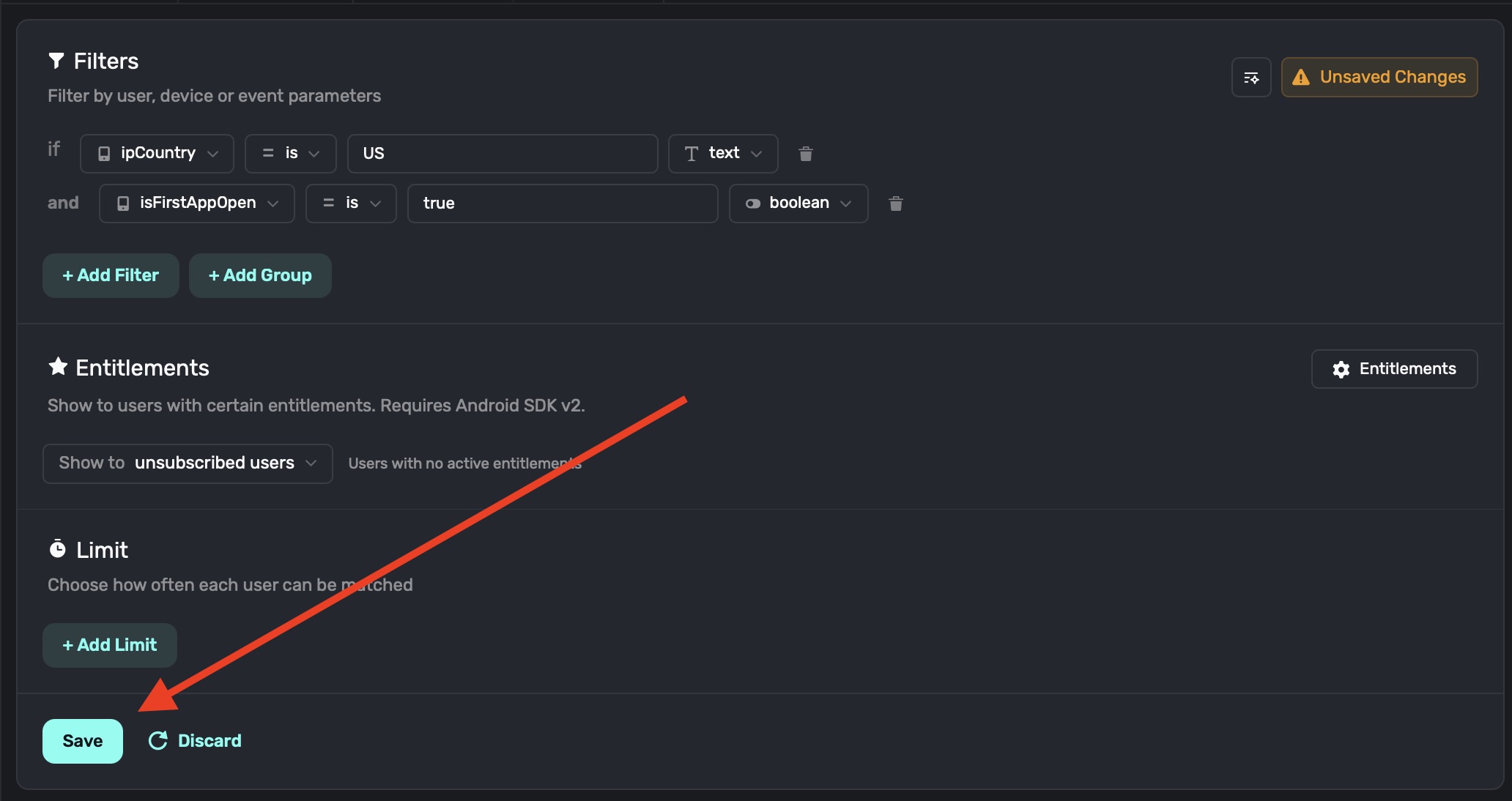 You can combine rules together, too. In the following example, if we only wanted the paywall to show on iOS, and not Android, you can simply click "+Add Filter" once more, and add the condition:
