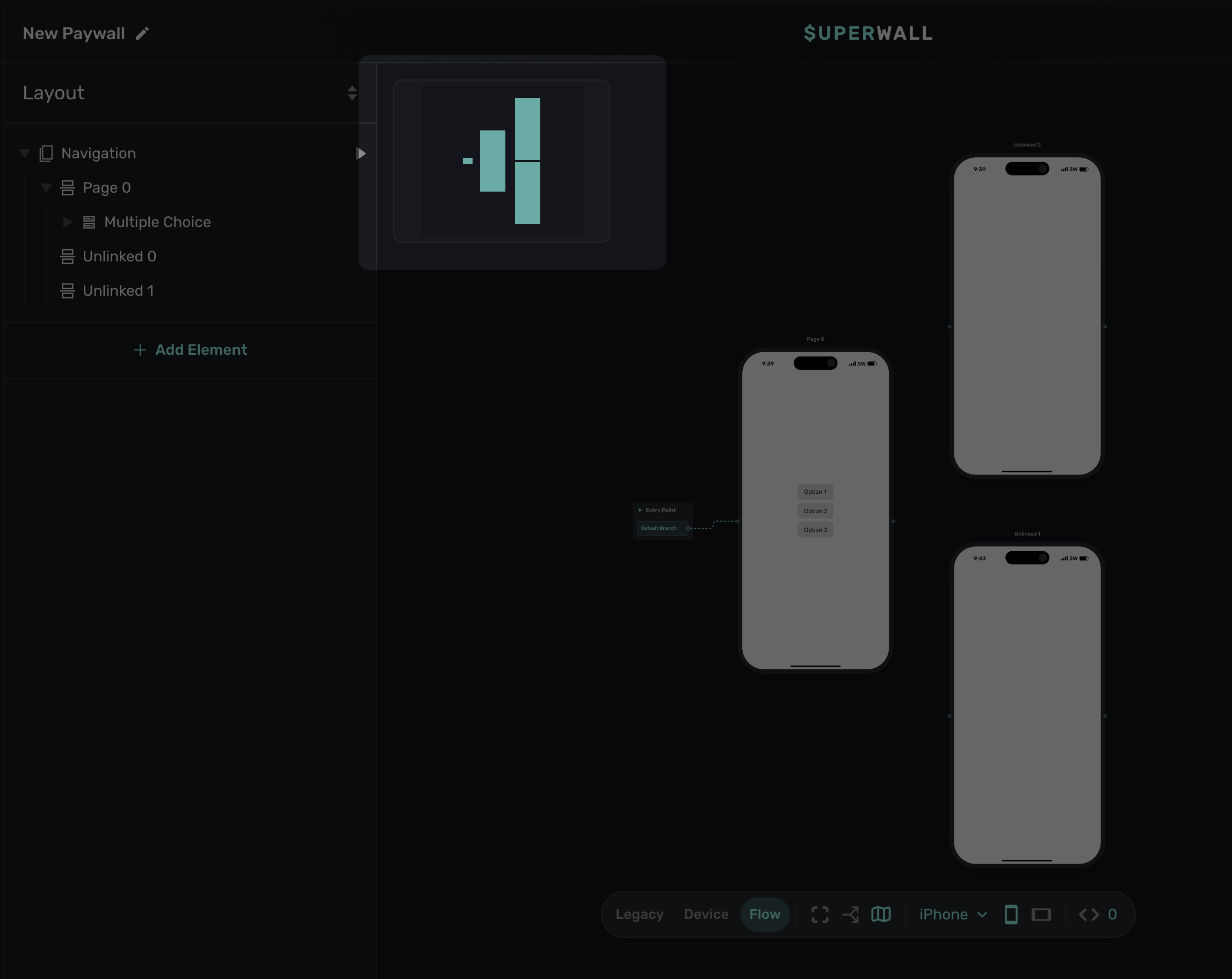 The Canvas is a display mode in the paywall editor tailored to help you see your entire flow laid out. It works similar to many design tool canvas' in that you can pan around, zoom to see the big picture, or click any page to focus it.