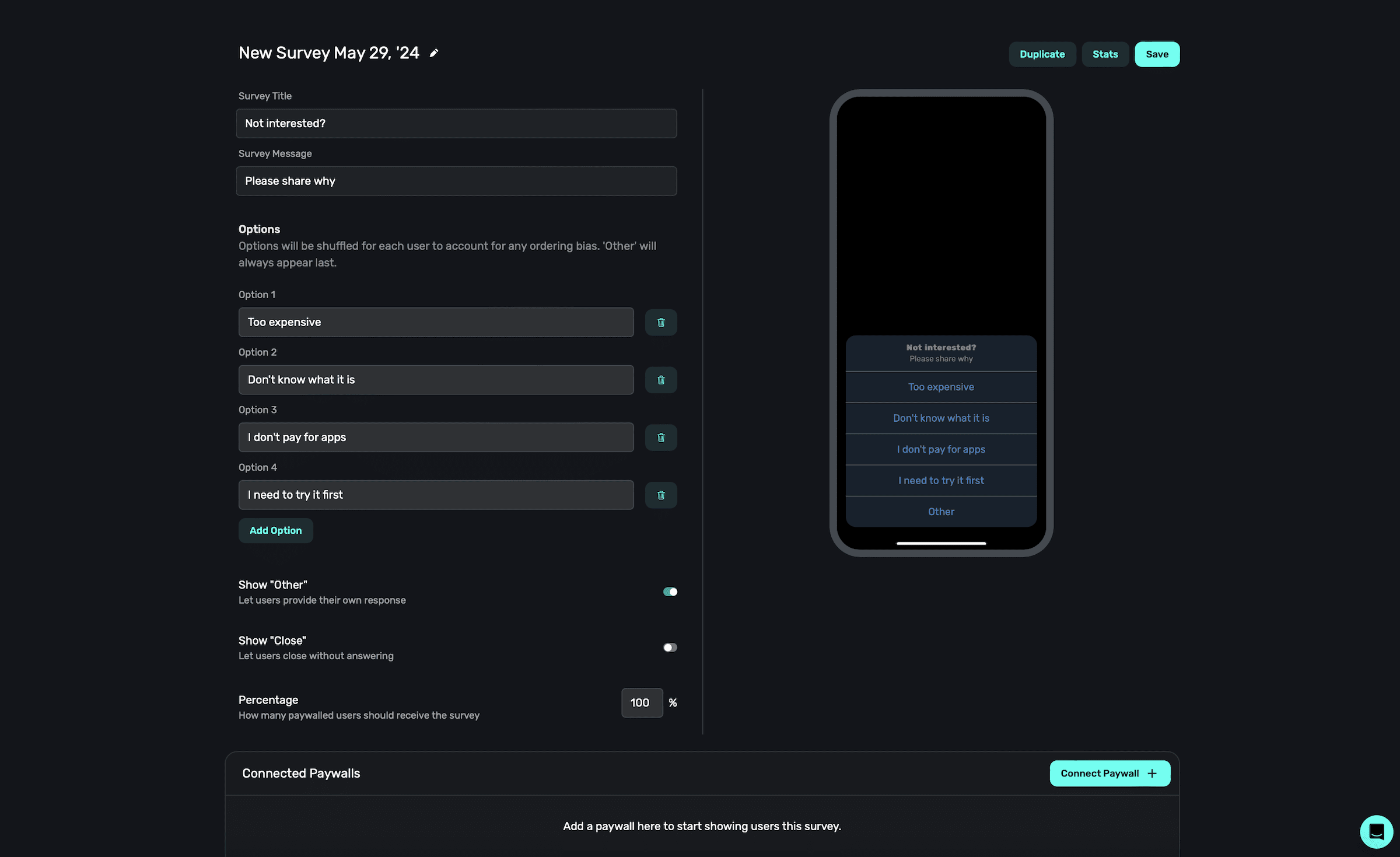 The "Other" button lets users type in a free text field. This is useful if users are willing to provide more context about why they declined (or purchased from) the paywall. If this is used, it will always display as the last option in the survey.