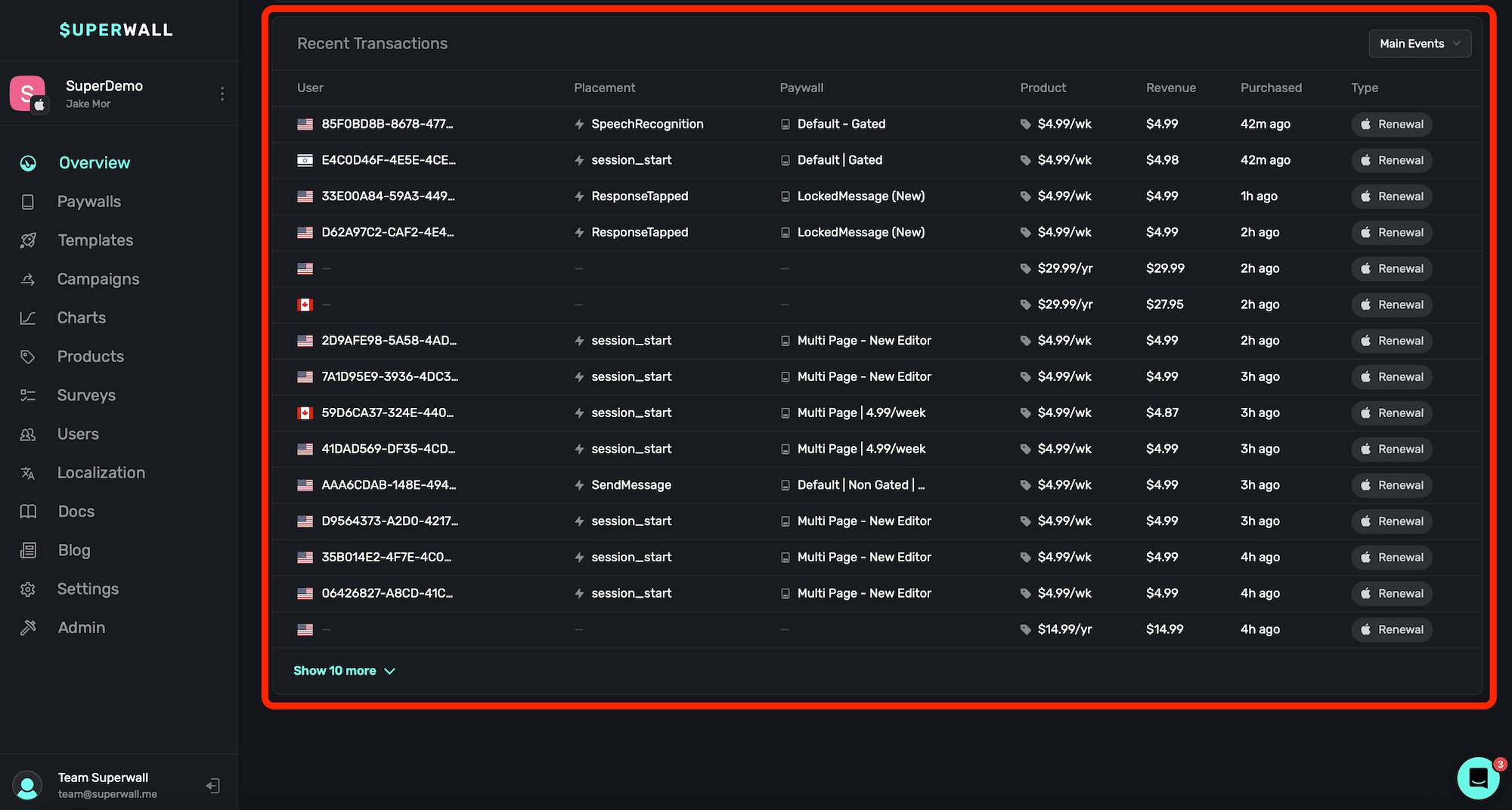 If you wish to make purchases outside of Superwall's SDK and paywalls, you can use observer mode to report purchases that will appear in the Superwall dashboard, such as transactions: