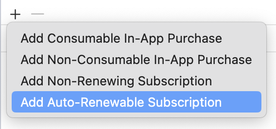 If you're using a local configuration, open Products.storekit, click the + button at the bottom and create a new product. In this tutorial, we'll create an auto-renewable subscription: