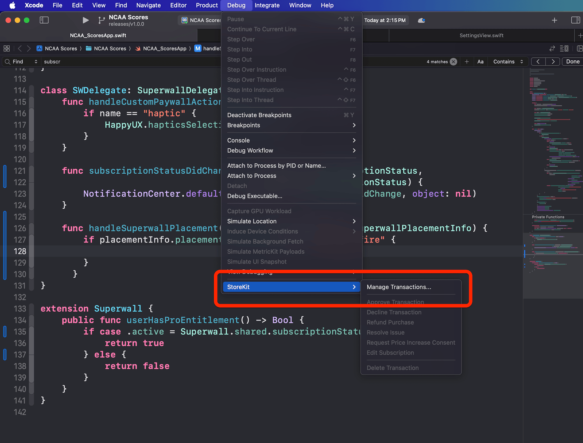 Once you've set up your StoreKit configuration file, you can leverage Xcode's Transaction Manager. Find it under Debug -> StoreKit -> Manage Transactions...: