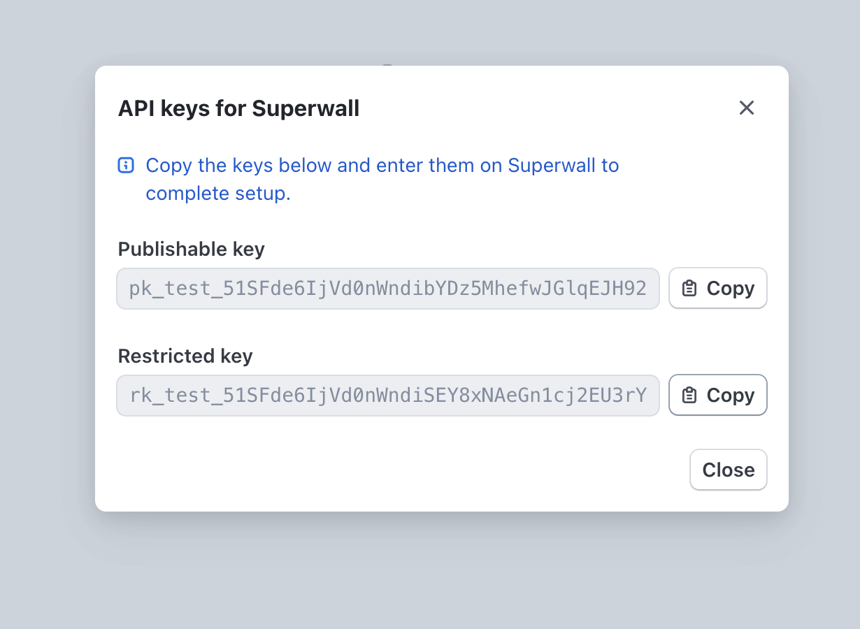 The Superwall Stripe app provides both live and test mode keys. Make sure you're in the correct mode in your Stripe dashboard when copying keys.