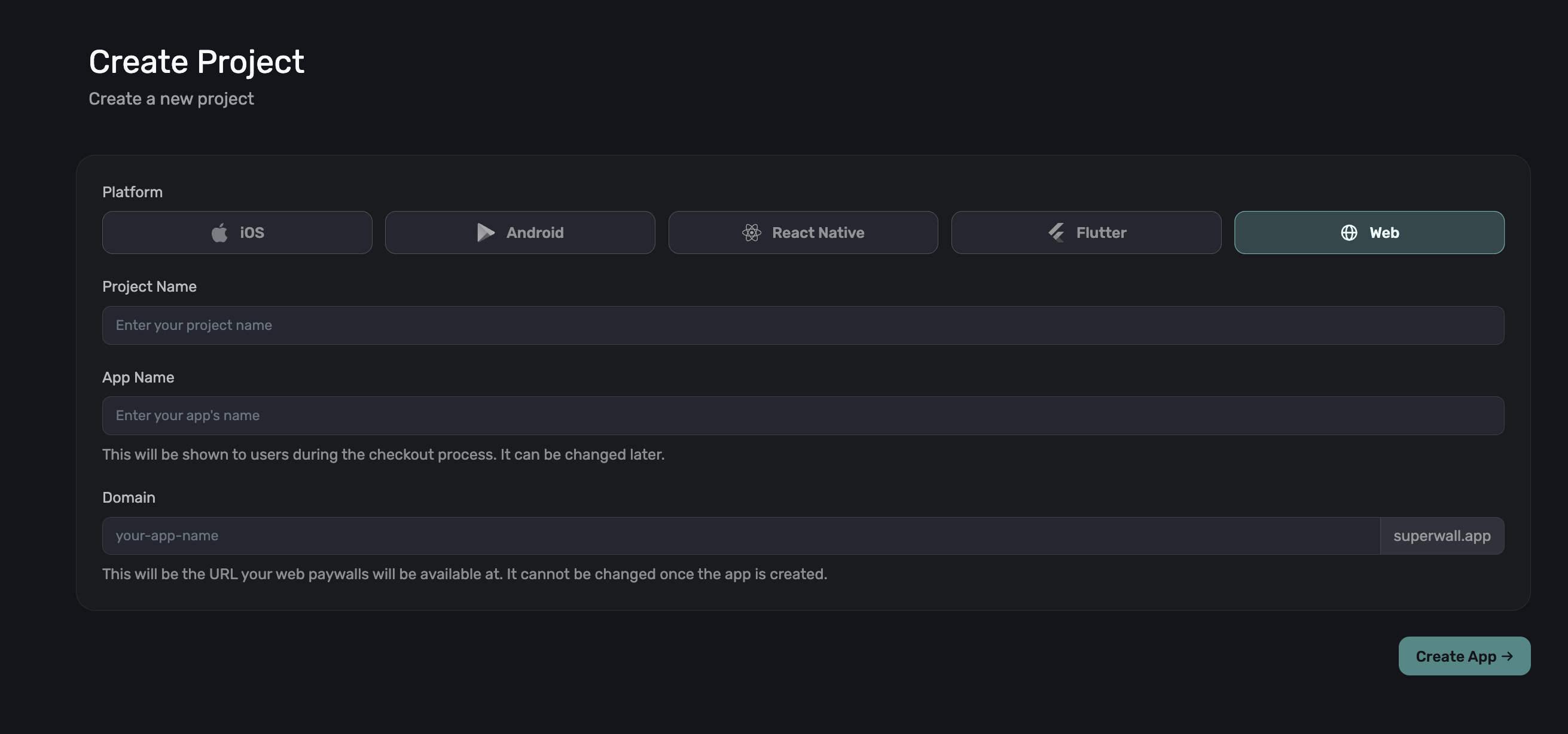 Create a new app in Superwall for your web product in a new or existing project. Follow the steps in Creating an App.